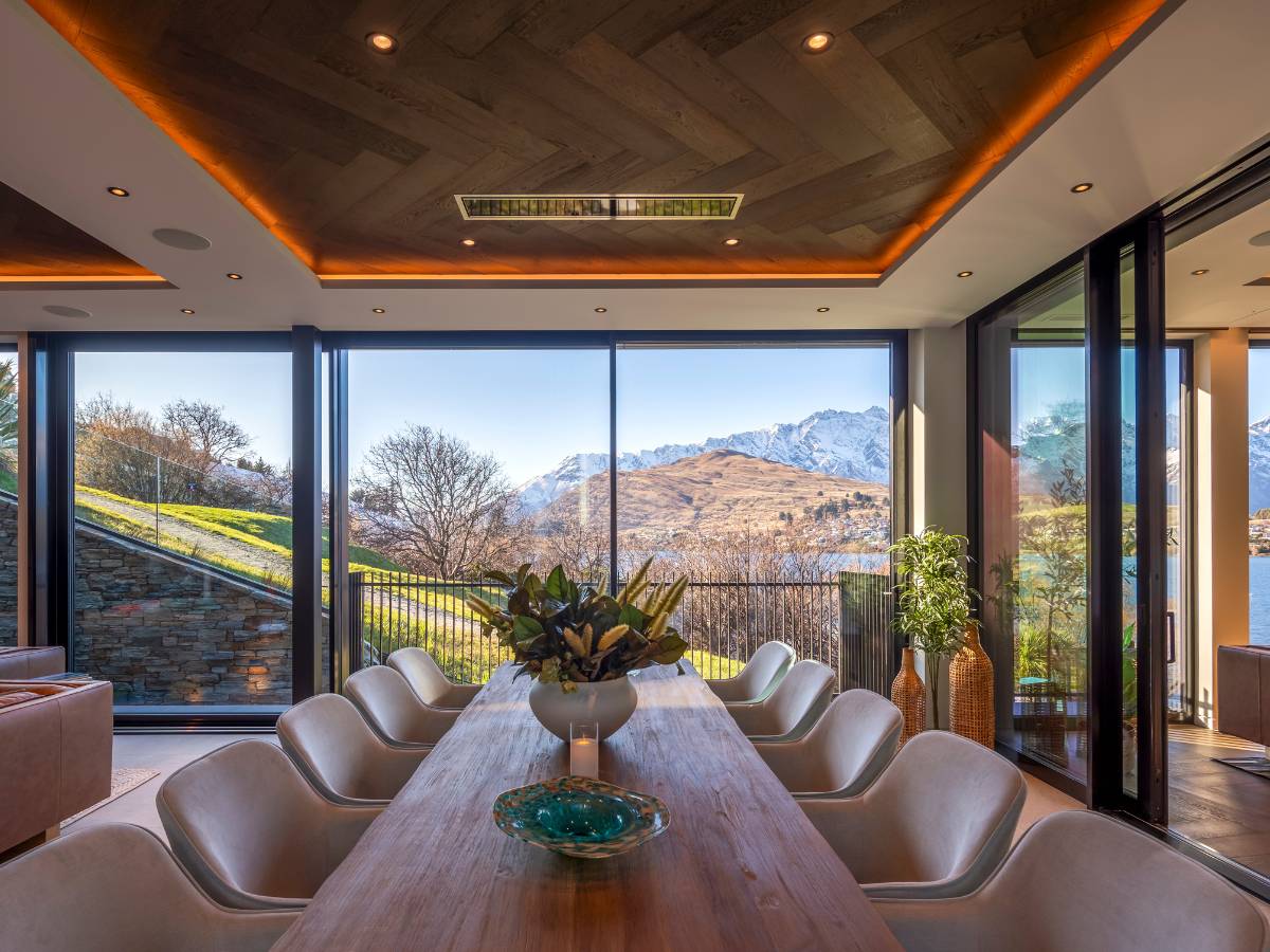 Designed for entertaining, this remarkable villa boasts four distinct living areas and two elegant dining spaces. The main open-plan living area houses a stylish kitchen space with imported Quartzite benchtops, two sinks and dishwashers, along with a state-of-the-art five-burner Gaggenau gas cooktop and oven. Every meal an occasion to remember when seated at the large kitchen island with space for five, or the dining table for twelve with mesmerising views of Lake Wakatipu.