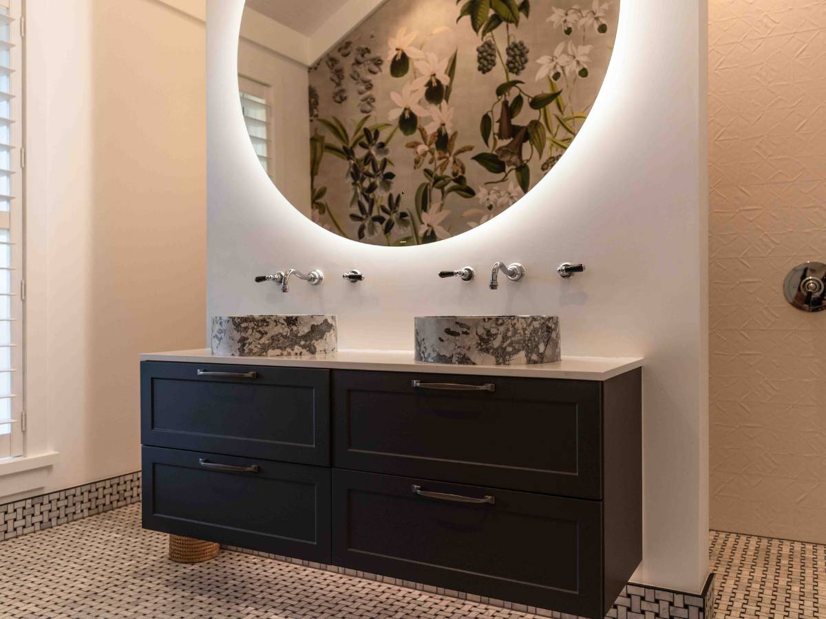 Downstairs, a contemporary take on the classic Kiwi bach offers a comfortable living space for teenagers and additional guests. This space includes a second bedroom with a stunning ensuite bathroom, a bunk room, a kitchenette, and a laundry room with its own entrance.