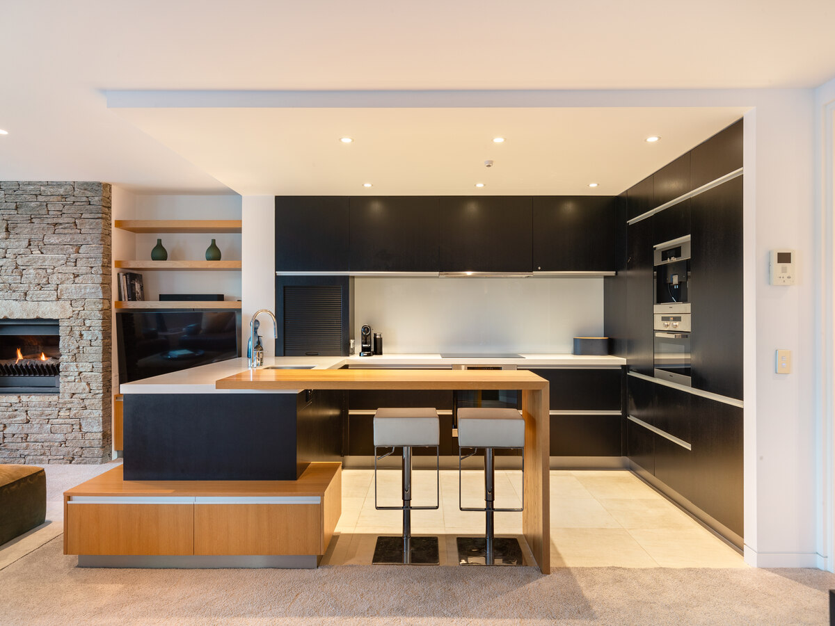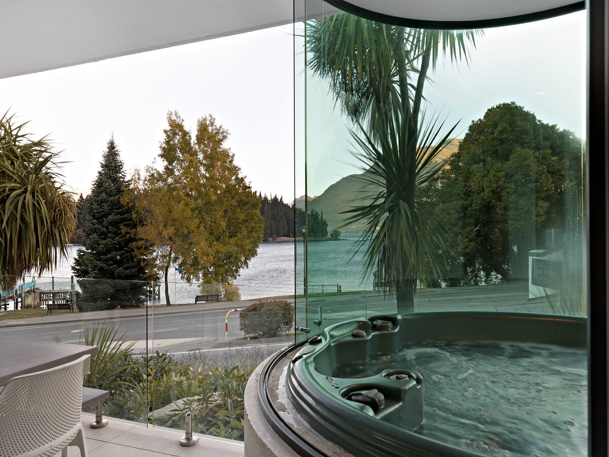 This central single-level apartment offers a comfortable and stylish retreat for families or groups, offering stunning views of Queenstown’s vibrant lakefront. Large sliding doors open to a balcony, perfect for enjoying the lakefront scenery with a glass of Central Otago wine. Relax by the cosy gas fireplace in the open-plan living area, or unwind in your private spa pool. The state-of-the-art kitchen is any chef’s dream, featuring a large breakfast bar and all the modern conveniences. If you love to cook outdoors, there’s a Weber BBQ and outdoor dining setting so you can take in the fresh mountain air.