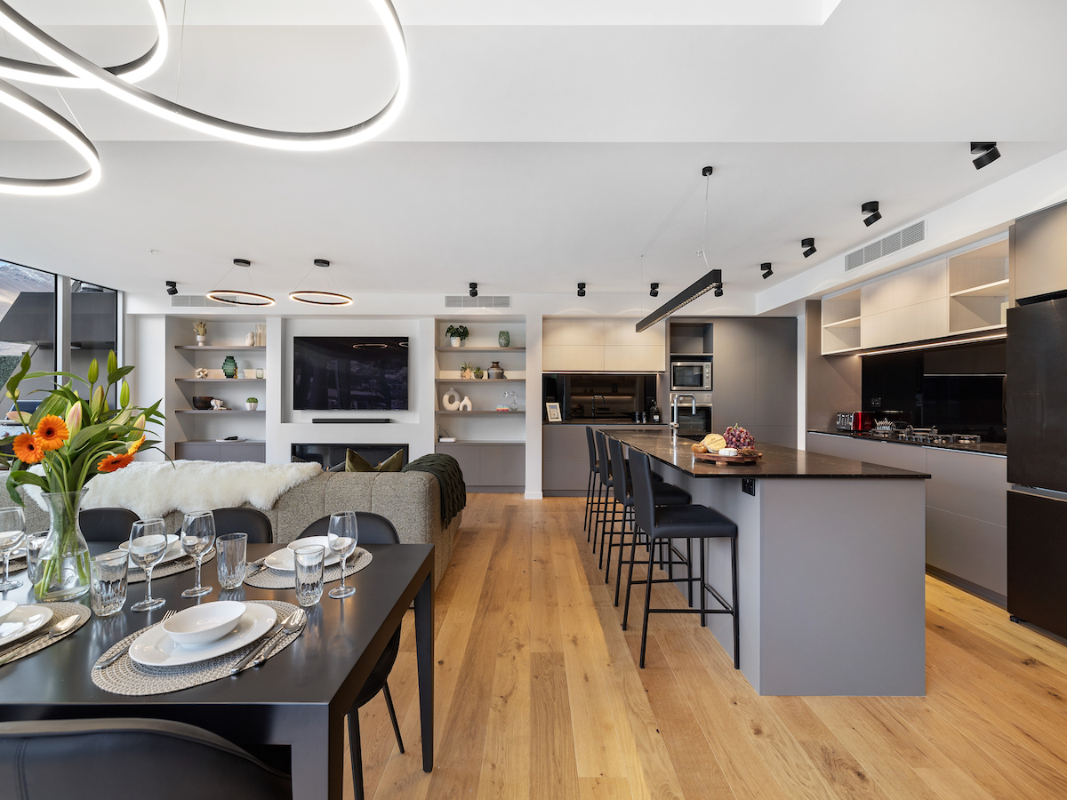 The Essence of QT Queenstown features a stunning open plan kitchen, living and dining area with glass sliding doors opening to a spacious deck, showcasing those quintessential views for which Queenstown is famous. Modern amenities ensure you stay will be comfortable, including the ducted heating and a gas fire create a warming ambience and ensure you are cosy on even the coldest of winter days, while the air-conditioning will ensure you keep cool on those hot summer days.